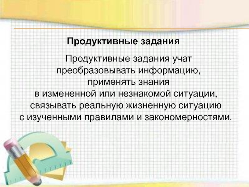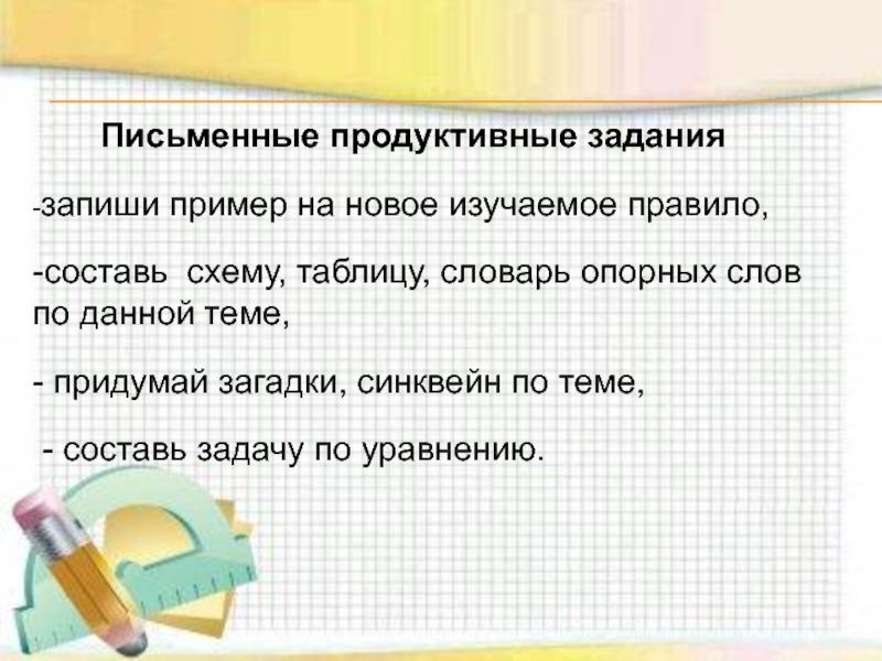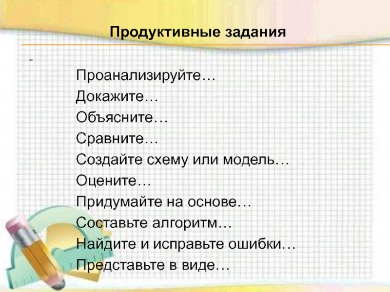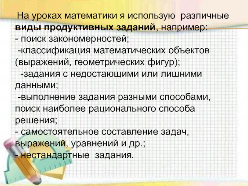 Слайд 12 На уроках математики я использую различные виды продуктивных заданий, например: