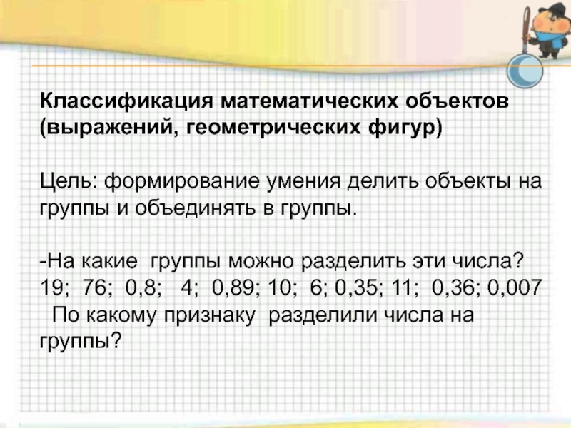 Слайд 14Классификация математических объектов (выражений, геометрических фигур)
