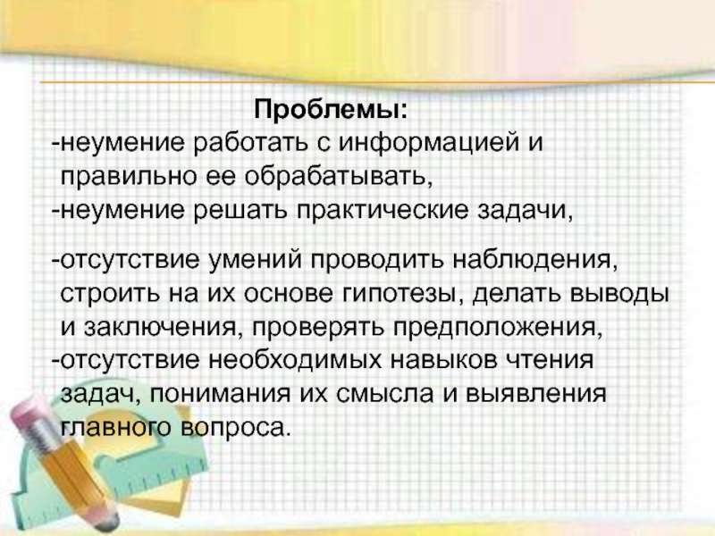 отсутствие необходимых навыков чтения задач, понимания их смысла и выявления главного вопроса.