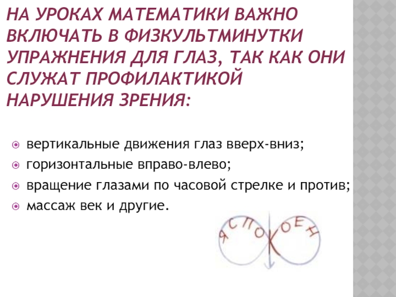 Слайд 9НА УРОКАХ МАТЕМАТИКИ ВАЖНО ВКЛЮЧАТЬ В ФИЗКУЛЬТМИНУТКИ УПРАЖНЕНИЯ ДЛЯ ГЛАЗ, ТАК