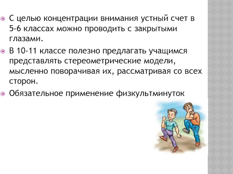Слайд 8С целью концентрации внимания устный счет в 5-6 классах можно проводить