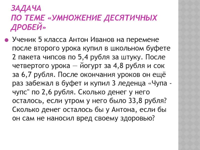 перемене после второго урока купил в школьном буфете 2 пакета чипсов по 5,4 рубля за штуку. После четвертого урока — йогурт за 4,8 рубля и сок за 6,7 рубля. После окончания уроков он ещё раз забежал в буфет и купил 3 леденца «Чупа - чупс" по 2,6 рубля. Сколько денег у него осталось, если утром у него было 33,8 рубля? Сколько денег осталось бы у Антона, если бы он сам не наносил вред своему здоровью?