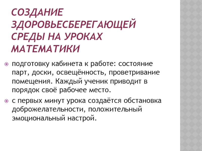 Слайд 6СОЗДАНИЕ ЗДОРОВЬЕСБЕРЕГАЮЩЕЙ СРЕДЫ НА УРОКАХ МАТЕМАТИКИ