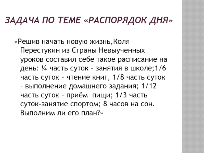 Невыученных уроков составил себе такое расписание на день: ¼ часть суток – занятия в школе;1/6 часть суток – чтение книг, 1/8 часть суток – выполнение домашнего задания; 1/12 часть суток – приём пищи; 1/3 часть суток-занятие спортом; 8 часов на сон. Выполним ли его план?»