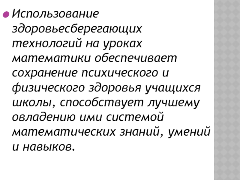 Слайд 16Использование здоровьесберегающих технологий на уроках математики обеспечивает сохранение психического и физического