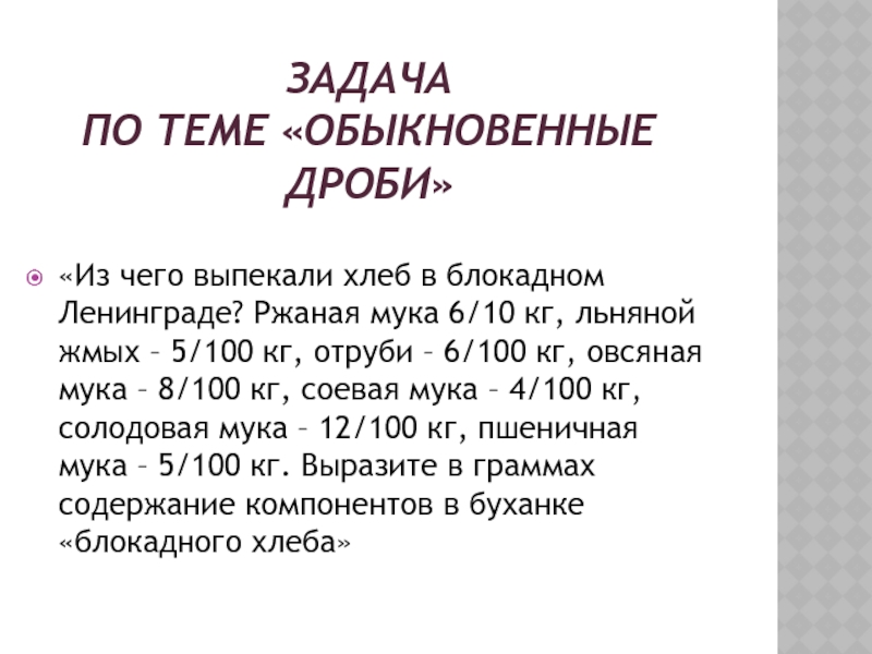 Ржаная мука 6/10 кг, льняной жмых – 5/100 кг, отруби – 6/100 кг, овсяная мука – 8/100 кг, соевая мука – 4/100 кг, солодовая мука – 12/100 кг, пшеничная мука – 5/100 кг. Выразите в граммах содержание компонентов в буханке «блокадного хлеба»