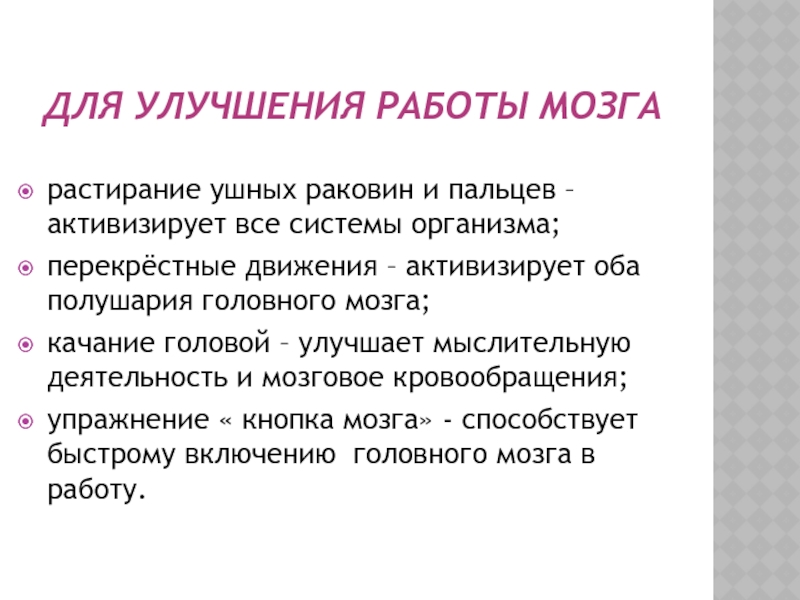 Слайд 11ДЛЯ УЛУЧШЕНИЯ РАБОТЫ МОЗГА