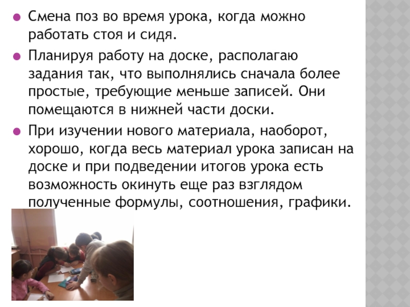 Слайд 7Смена поз во время урока, когда можно работать стоя и сидя.
