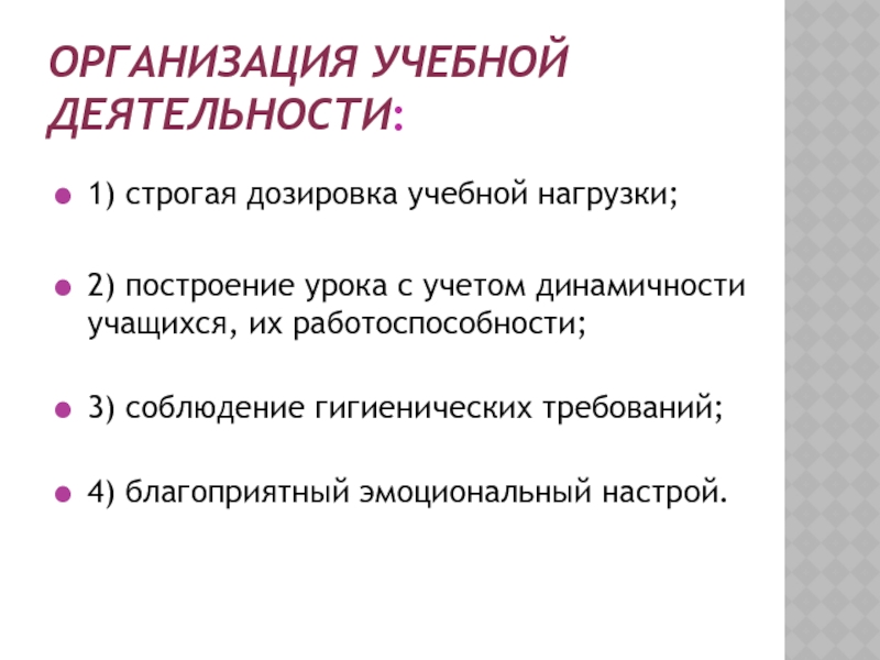 1) строгая дозировка учебной нагрузки;