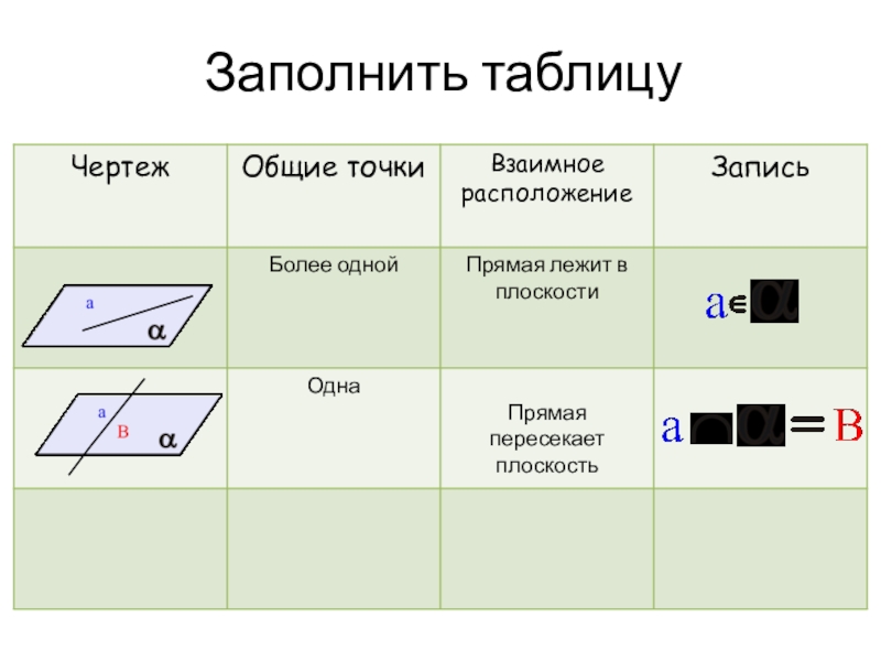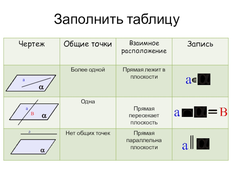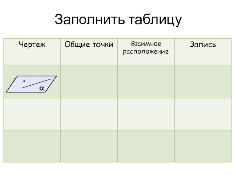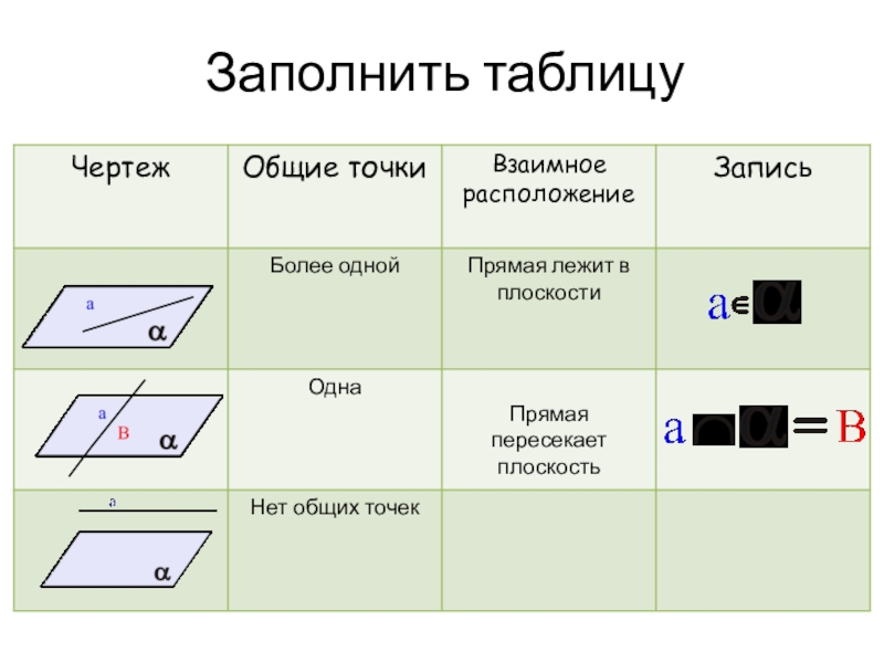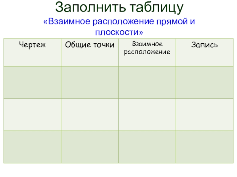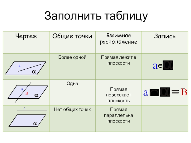 Слайд 1Заполнить таблицу «Взаимное расположение прямой и плоскости»