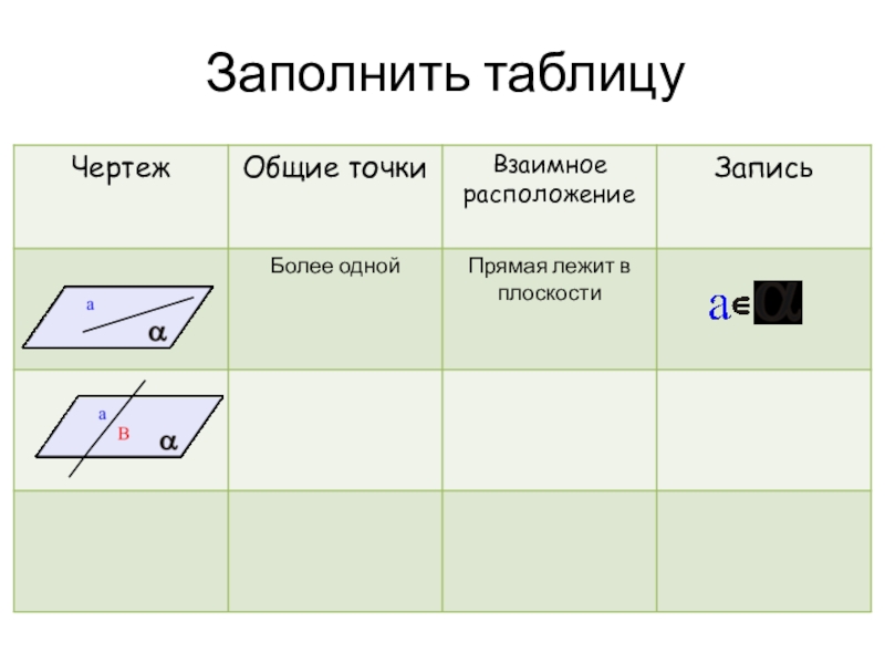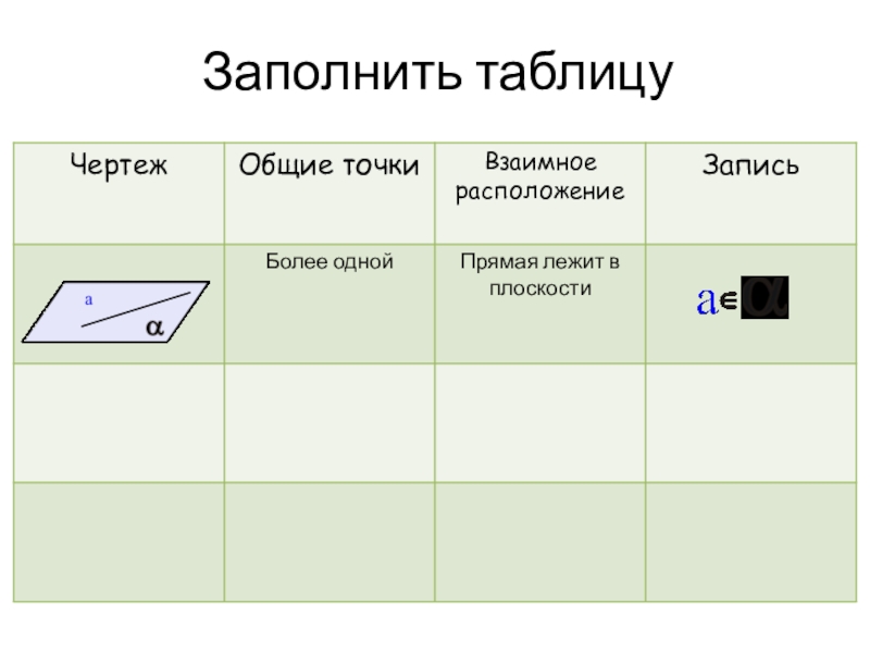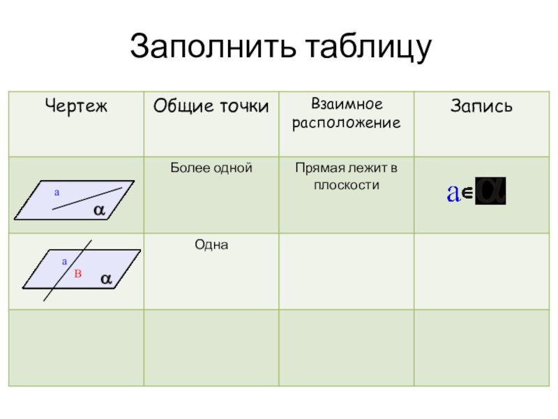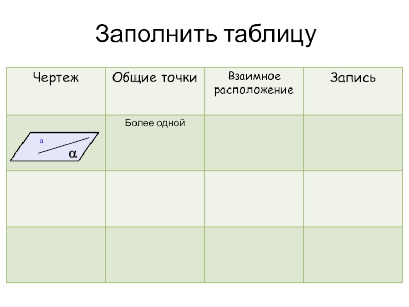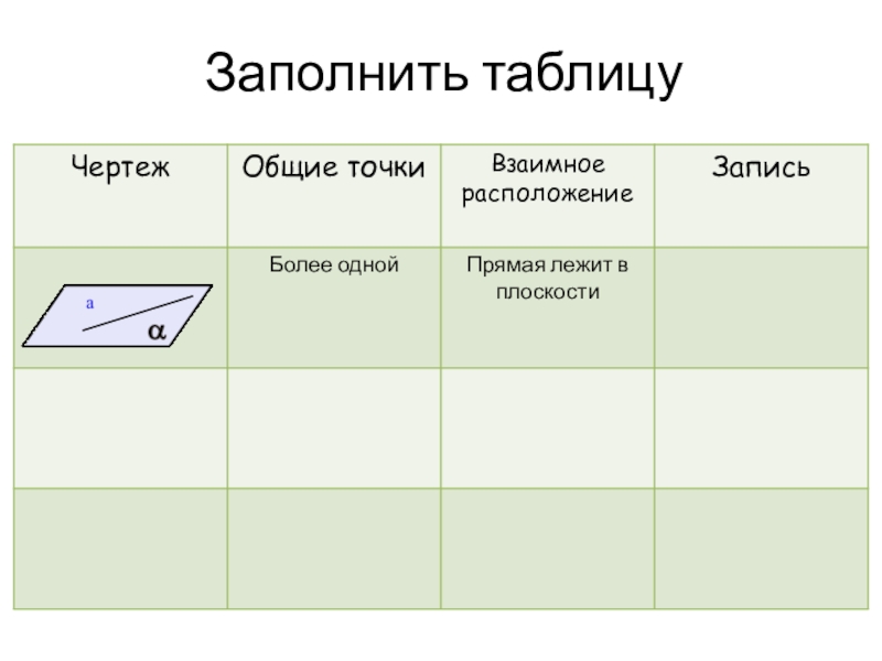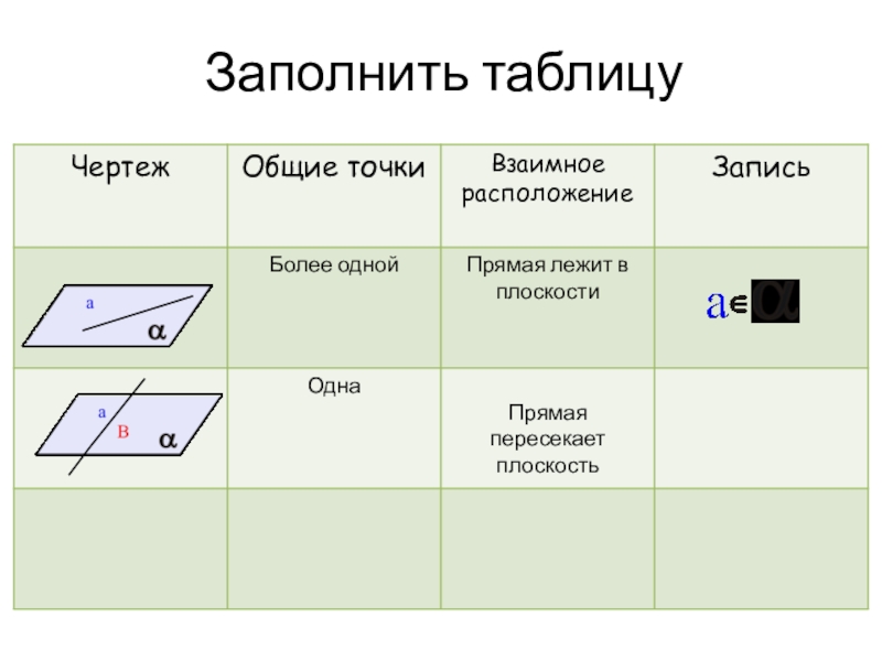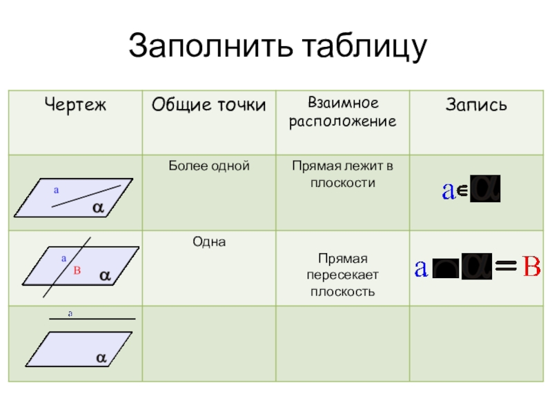 Слайд 1Заполнить таблицу «Взаимное расположение прямой и плоскости»