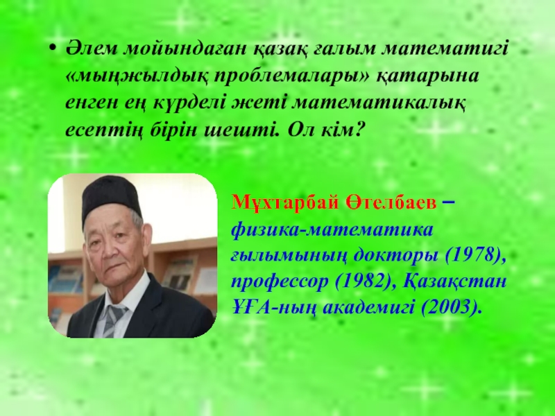 Мұхтарбай Өтелбаев – физика-математика ғылымының докторы (1978), профессор (1982), Қазақстан ҰҒА-ның академигі (2003).