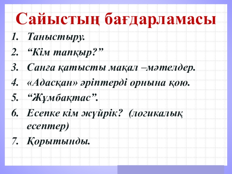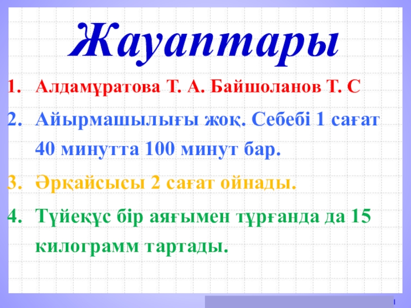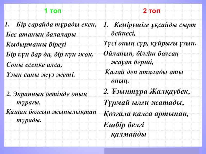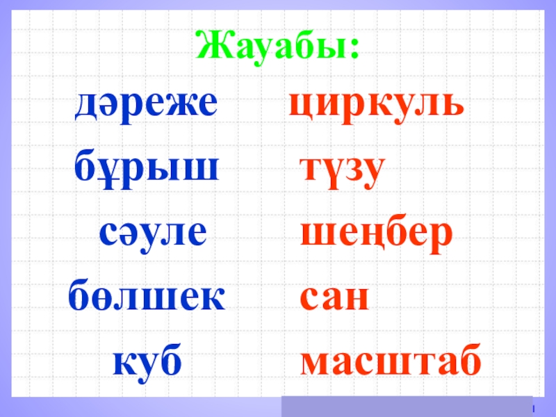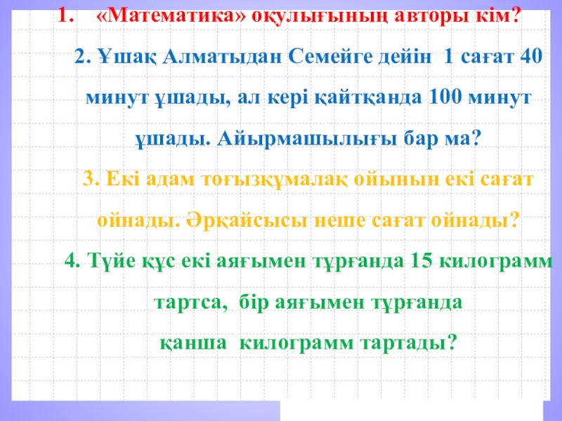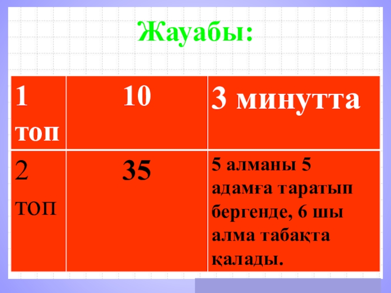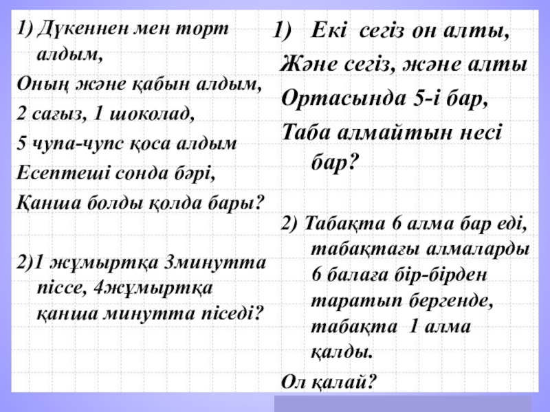 2) Табақта 6 алма бар еді, табақтағы алмаларды 6 балаға бір-бірден таратып бергенде, табақта 1 алма қалды.