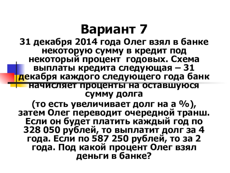 (то есть увеличивает долг на а %), затем Олег переводит очередной транш. Если он будет платить каждый год по 328 050 рублей, то выплатит долг за 4 года. Если по 587 250 рублей, то за 2 года. Под какой процент Олег взял деньги в банке?
