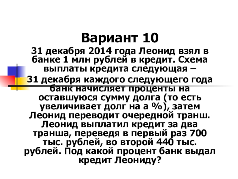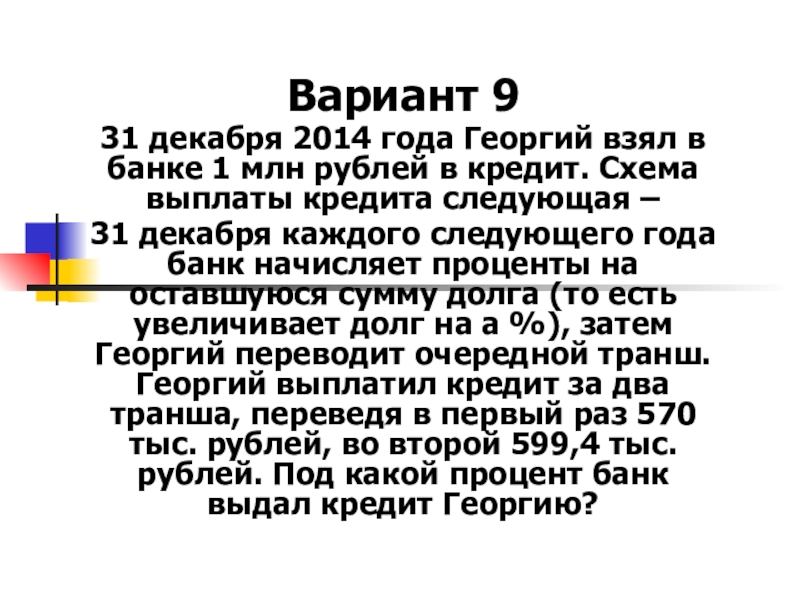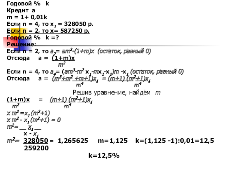 в кредит под некоторый процент годовых. Схема выплаты кредита следующая – 31 декабря каждого следующего года банк начисляет проценты на оставшуюся сумму долга