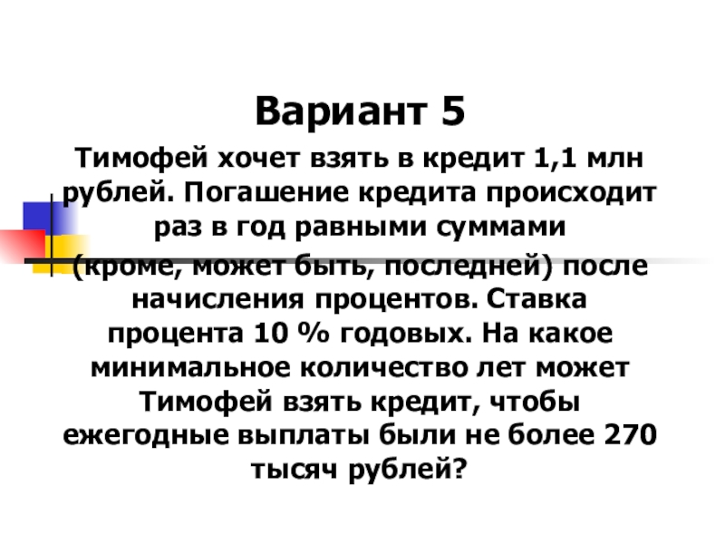 (кроме, может быть, последней) после начисления процентов. Ставка процента 10 % годовых. На какое минимальное количество лет может Тимофей взять кредит, чтобы ежегодные выплаты были не более 270 тысяч рублей?