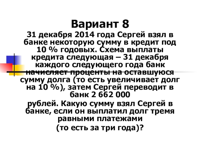 в кредит под 10 % годовых. Схема выплаты кредита следующая – 31 декабря каждого следующего года банк начисляет проценты на оставшуюся сумму долга (то есть увеличивает долг на 10 %), затем Сергей переводит в банк 2 662 000