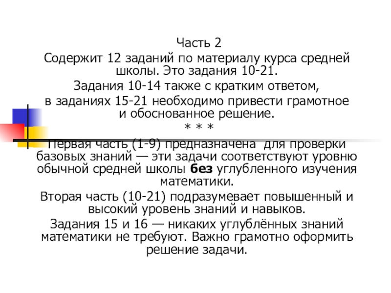 Первая часть (1-9) предназначена для проверки базовых знаний — эти задачи соответствуют уровню обычной средней школы без углубленного изучения математики.