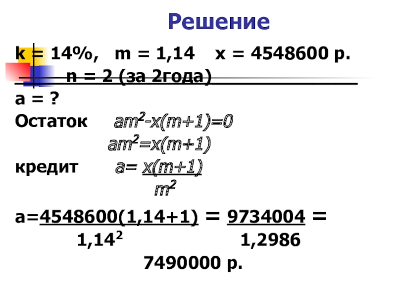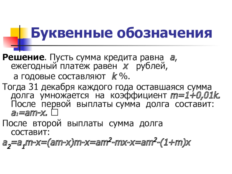 Тогда 31 декабря каждого года оставшаяся сумма долга умножается на коэффициент m=1+0,01k. После первой выплаты сумма долга составит: a1=am-x.