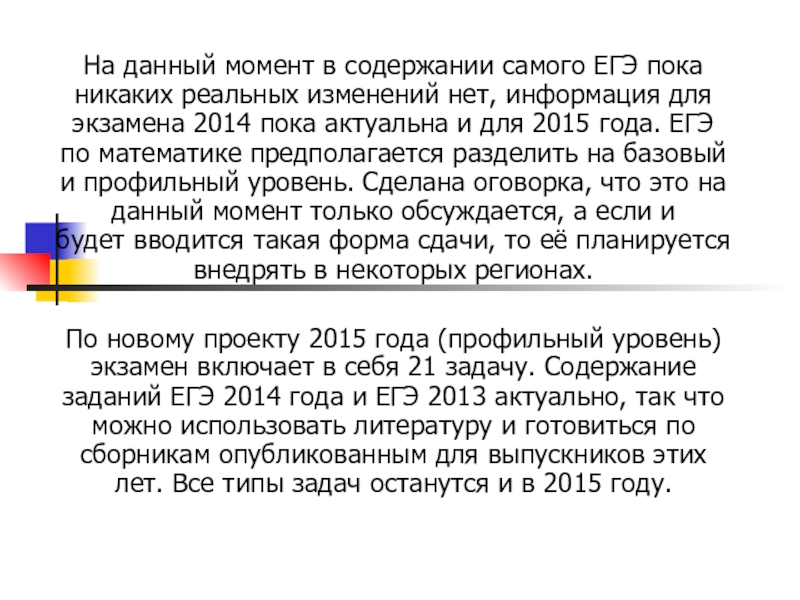 Слайд 2На данный момент в содержании самого ЕГЭ пока никаких реальных изменений