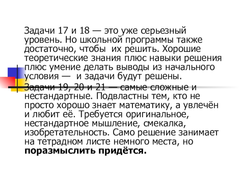 Задачи 17 и 18 — это уже серьезный уровень. Но школьной программы