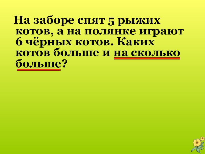 На заборе спят 5 рыжих котов, а на полянке играют 6 чёрных котов. Каких котов больше