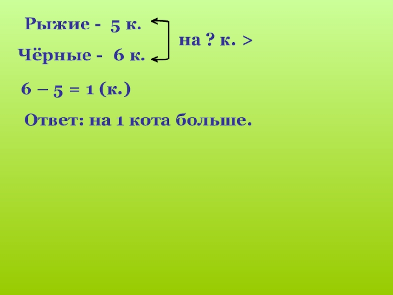Рыжие -Чёрные -5 к.6 к.на ? к. >6 – 5 = 1 (к.)Ответ: на 1 кота больше.