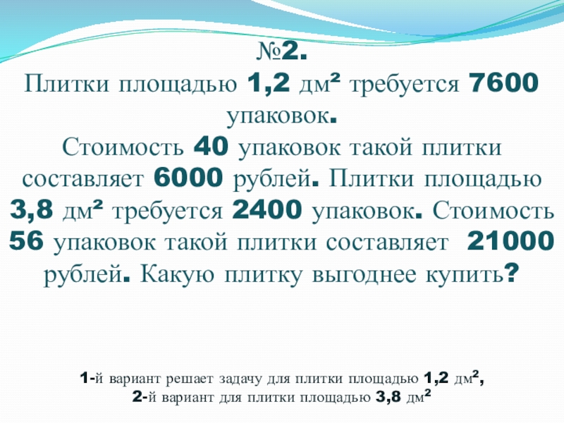 1-й вариант решает задачу для плитки площадью 1,2 дм2,
