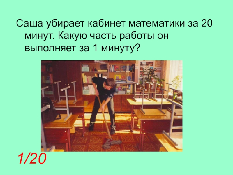 Саша убирает кабинет математики за 20 минут. Какую часть работы он