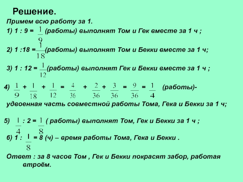 6) 1 : = 8 (ч) – время работы Тома, Гека и Бекки .
