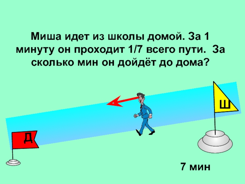 Миша идет из школы домой. За 1 минуту он проходит 1/7