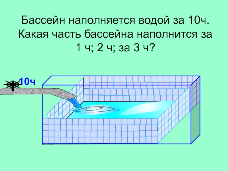 Бассейн наполняется водой за 10ч. Какая часть бассейна наполнится за 1