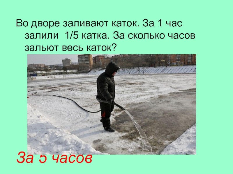Во дворе заливают каток. За 1 час залили 1/5 катка. За