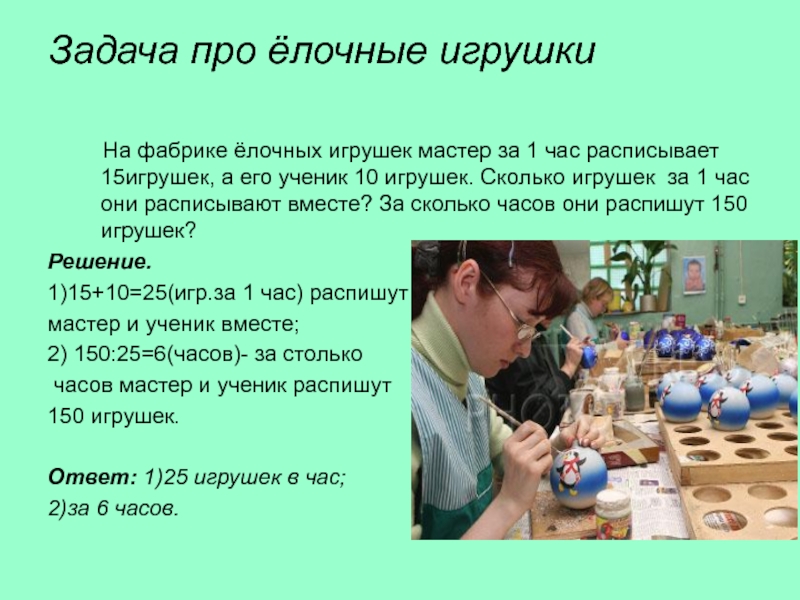 игрушек мастер за 1 час расписывает 15игрушек, а его ученик 10 игрушек. Сколько игрушек за 1 час они расписывают вместе? За сколько часов они распишут 150 игрушек?