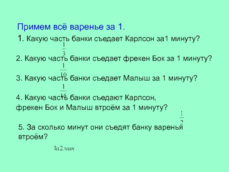 1. Какую часть банки съедает Карлсон за1 минуту?