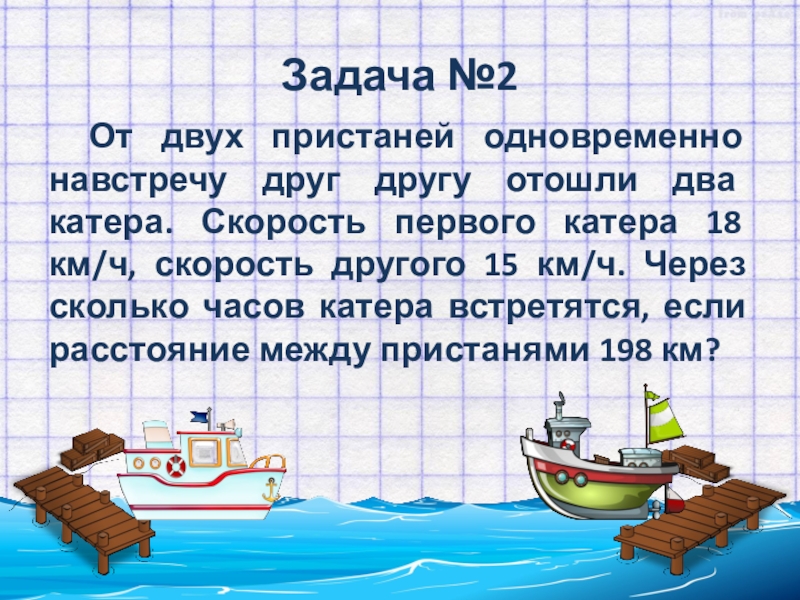 Задача №2	От двух пристаней одновременно навстречу друг другу отошли два катера. Скорость первого катера 18 км/ч, скорость
