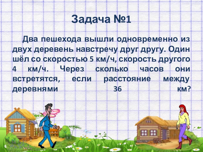 Задача №1 Два пешехода вышли одновременно из двух деревень навстречу друг другу. Один шёл со скоростью 5 км/ч, скорость другого 4 км/ч. Через сколько часов они встретятся, если расстояние между деревнями 36 км?