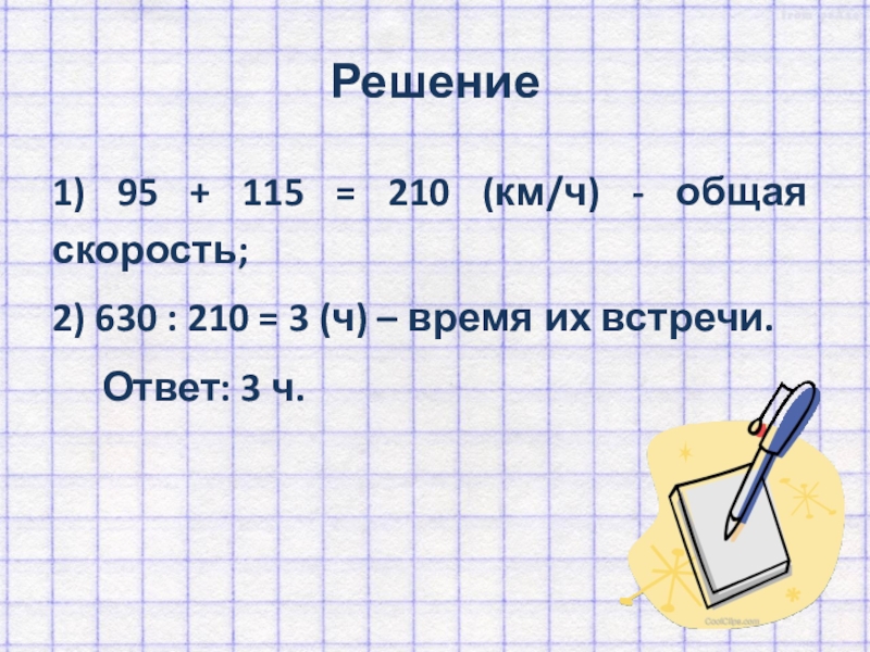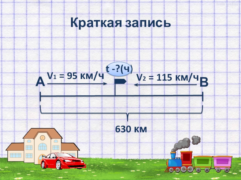 Краткая запись	АВV1 = 95 км/чV2 = 115 км/ч630 кмt -?(ч)