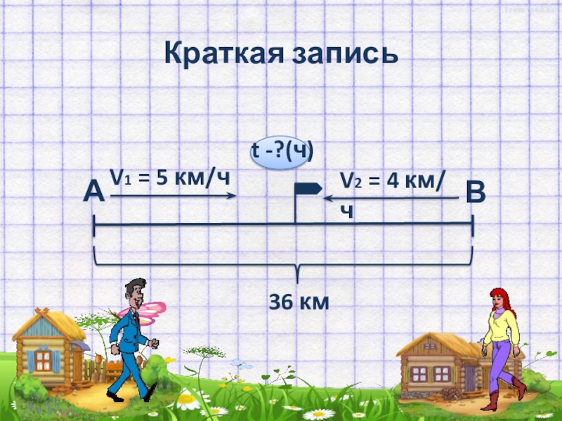 Краткая запись	АВV1 = 5 км/чV2 = 4 км/ ч36 кмt -?(ч)