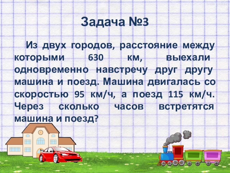 Задача №3	Из двух городов, расстояние между которыми 630 км, выехали одновременно навстречу друг другу машина и поезд.