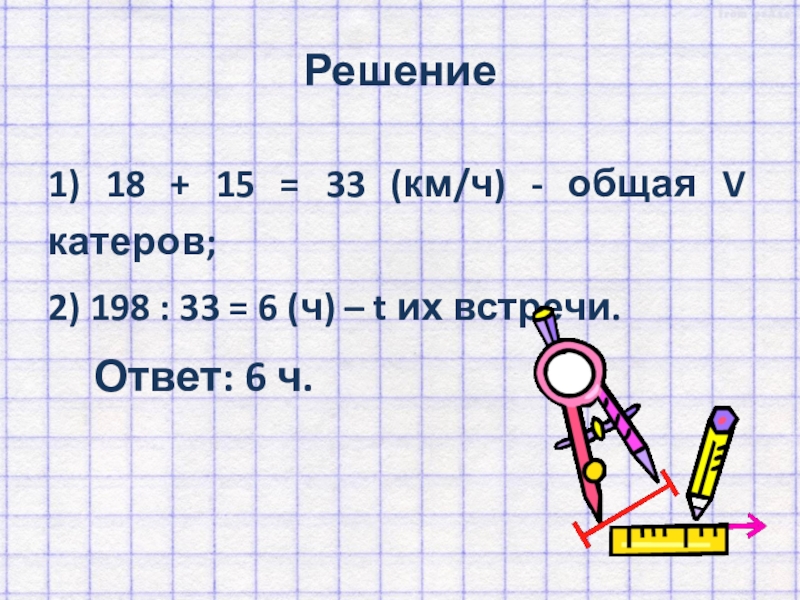 Решение1) 18 + 15 = 33 (км/ч) - общая V катеров;2) 198 : 33 = 6 (ч)