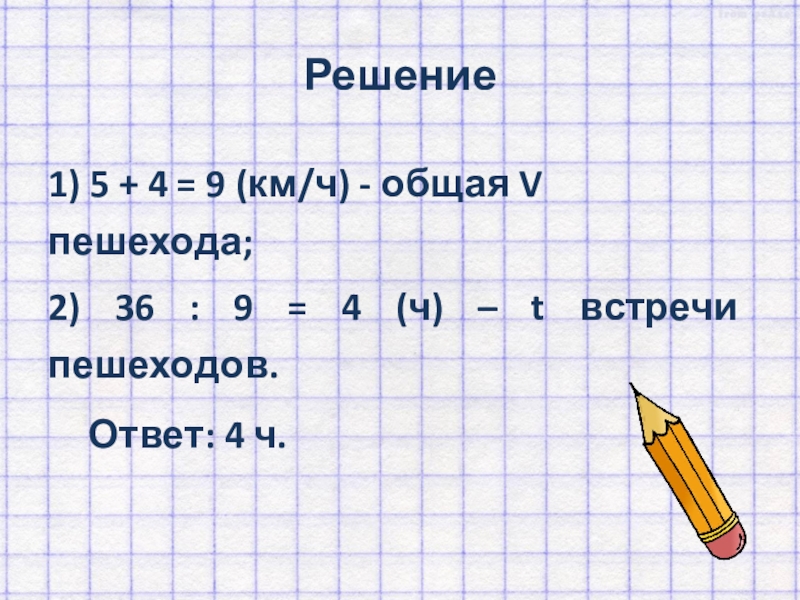 Решение1) 5 + 4 = 9 (км/ч) - общая V пешехода;2) 36 : 9 = 4 (ч)