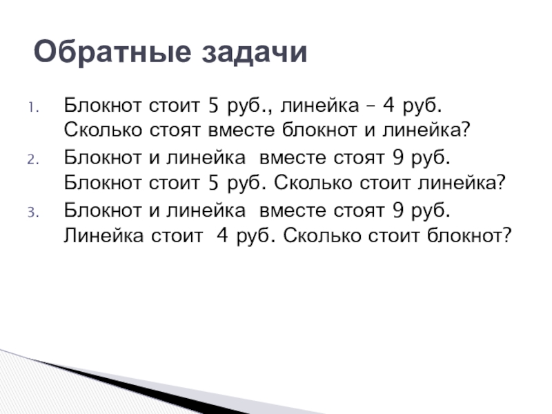 3. Блокнот и линейка вместе стоят 9 руб. Линейка стоит 4 руб. Сколько стоит блокнот?
