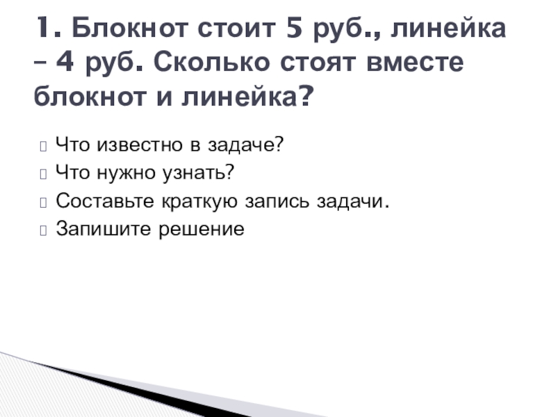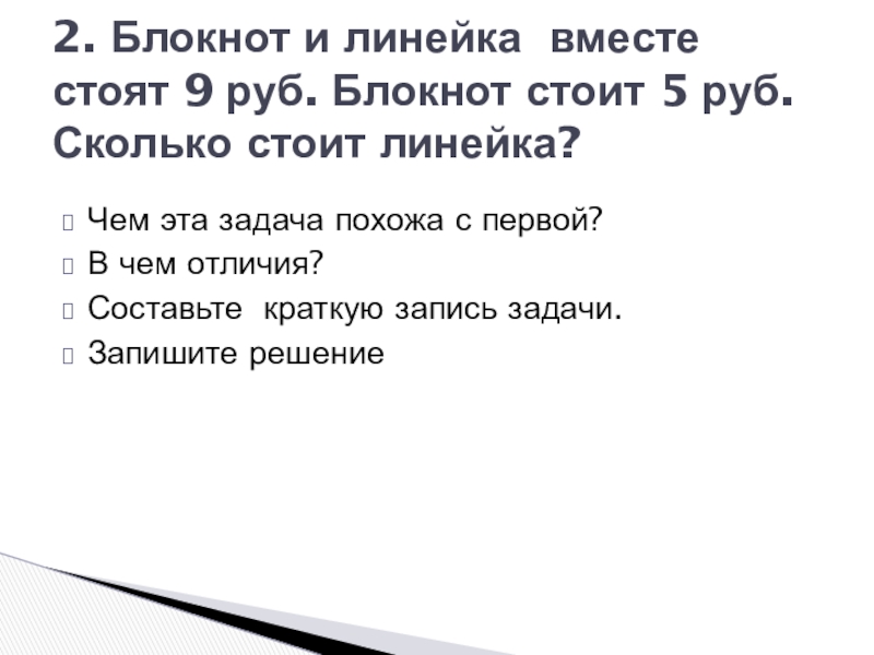 2. Блокнот и линейка вместе стоят 9 руб. Блокнот стоит 5 руб. Сколько стоит линейка?