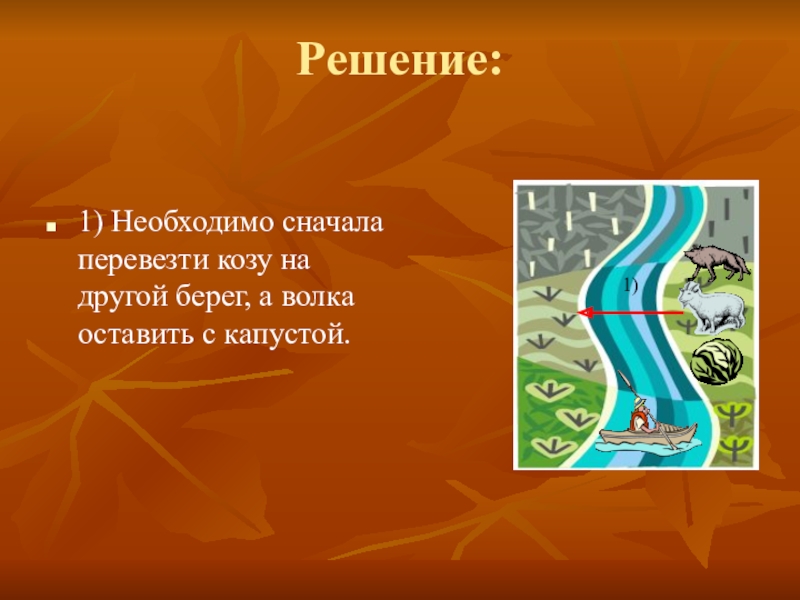 Решение:1) Необходимо сначала перевезти козу на другой берег, а волка оставить с капустой.1)