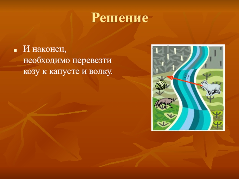 РешениеИ наконец, необходимо перевезти козу к капусте и волку.   5)