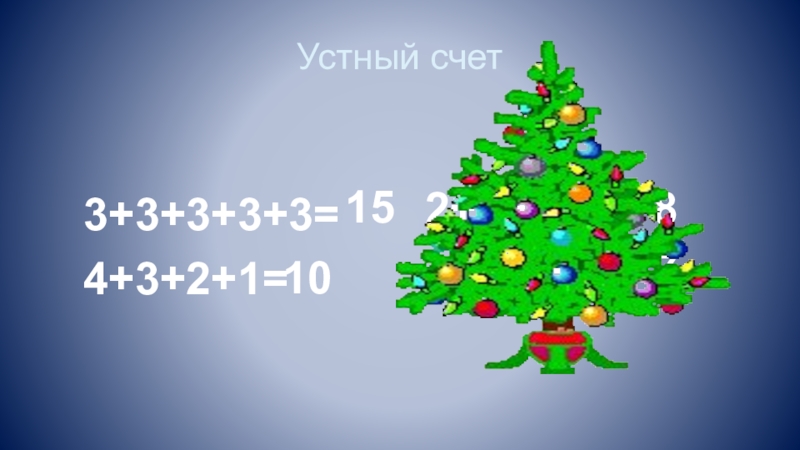 Устный счет2+2+2+2=3+1+2+1=3+3+3+3+3=4+3+2+1= 151087