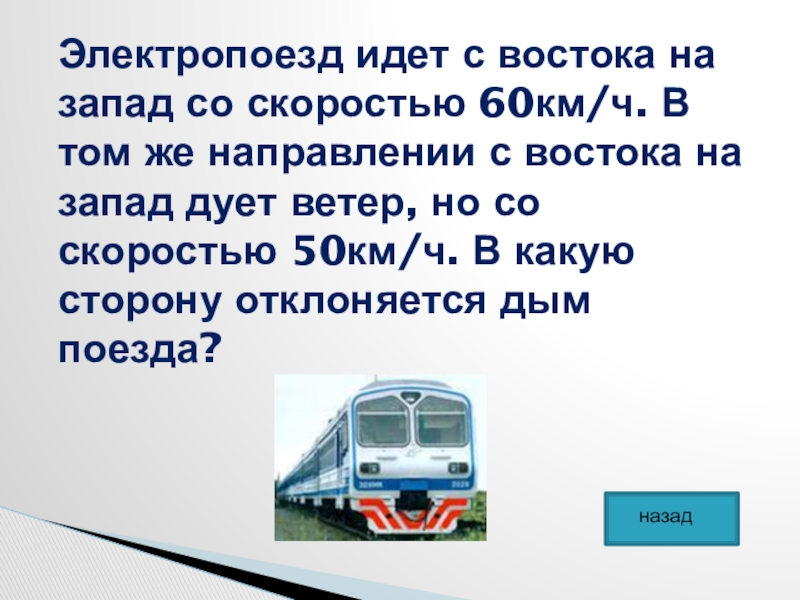 Слайд 25Электропоезд идет с востока на запад со скоростью 60км/ч. В том