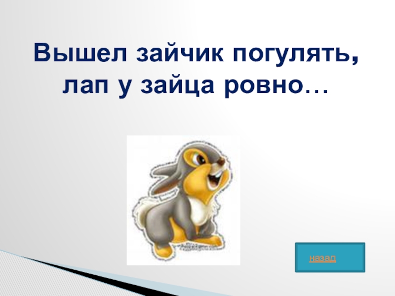 Слайд 35Вышел зайчик погулять, лап у зайца ровно…