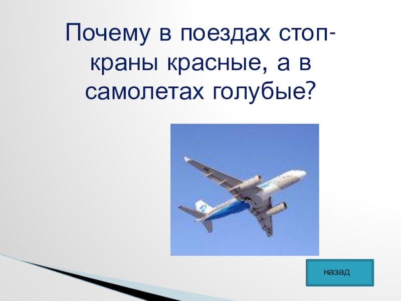 Слайд 22Почему в поездах стоп-краны красные, а в самолетах голубые?
